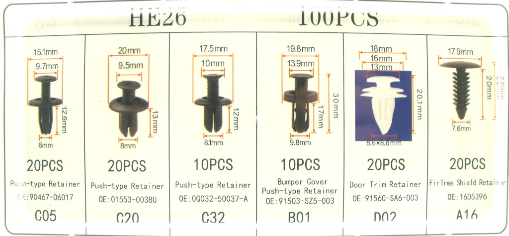 Univerzális készlet 100 db-os különféle autópatentekből, csapokból, autós pattintókból az autó kárpitjainak rögzítéséhez, sárvédők, lökhárítók, ajtók stb.