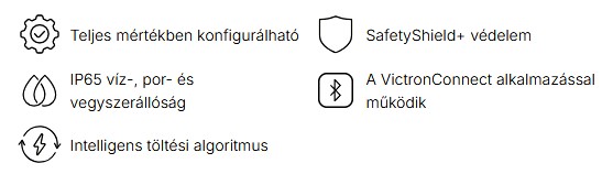 - Beépített Bluetooth – Teljes kontroll a telefonjáról: Nincs több találgatás! A VictronConnect alkalmazáson keresztül okostelefonján, tabletjén vagy számítógépén azonnal láthatja a töltési állapotot, a feszültséget és az áramerősséget. Sőt, a beállításokat is távolról módosíthatja.