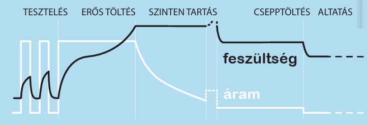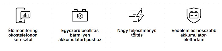 - Intelligens, 7 lépcsős töltési algoritmus: A töltő nem egyszerűen áramot küld az akkumulátorba. Egy kifinomult, hét lépésből álló folyamat során teszteli, tölti, majd csepptöltéssel szinten tartja az akkumulátort, így maximalizálva annak élettartamát.