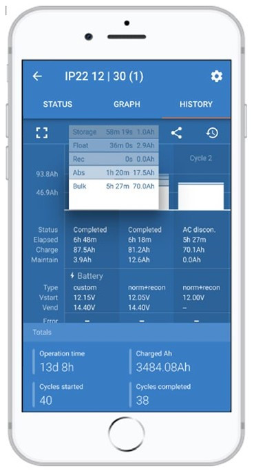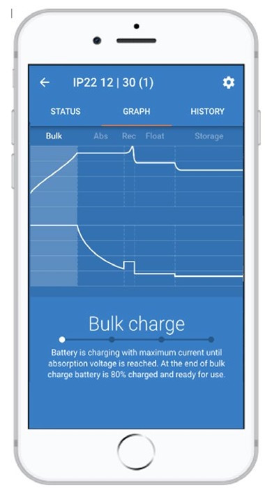 - Bluetooth Smart vezérlés: Kövesse nyomon a feszültséget és az áramerősséget, módosítsa a beállításokat, és frissítse a szoftvert vezeték nélkül, a VictronConnect alkalmazáson keresztül.