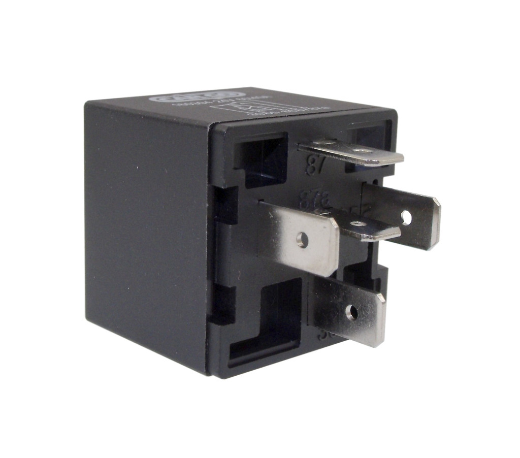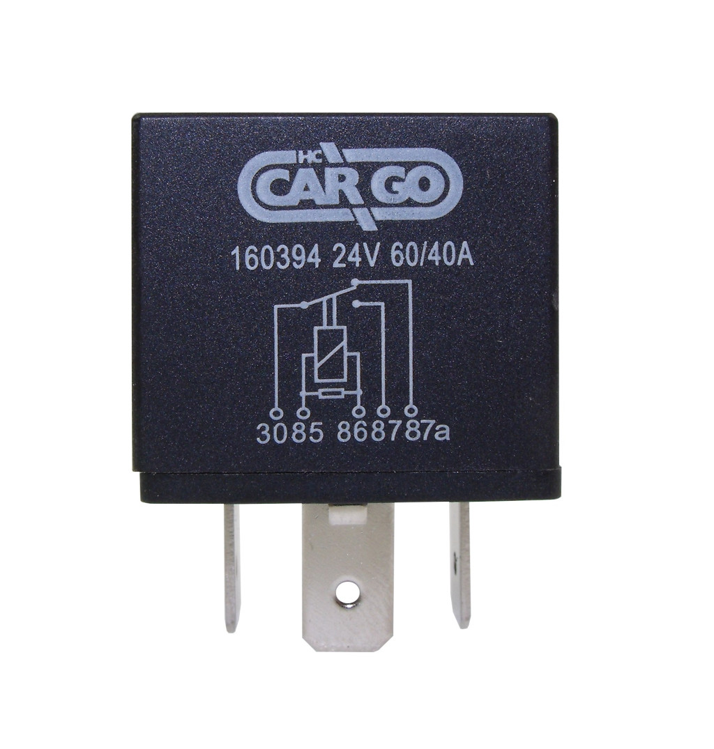 Ez a HC-Cargo 160394 típusú váltórelé nagyáramú fogyasztók kapcsolására alkalmas 24V-os járművekben (teherautók, buszok, munkagépek, ipari berendezések). A relé beépített ellenállással rendelkezik, amely megakadályozza a relé tekercséből keletkező feszültségcsúcsok káros hatásait, így védi a vezérlő elektronikát és a kapcsolókat.